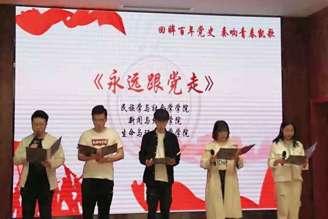 与传播学院、生命与环境科学学院、美术学院、教育学院的5位团委副书记共同朗诵了《永远跟党走》,歌颂建党百年以来中国共产党为祖国建设所做出的伟大历史贡献。