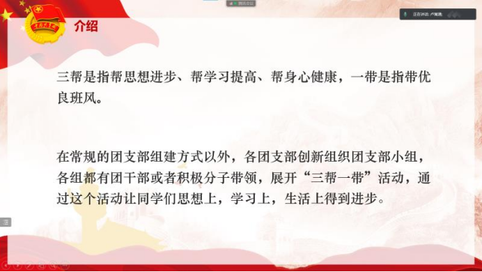 接下来,组织部部长卢寓通向2021级各支部团支书明确了团干部的工作原则与基本目标,阐述了“班团一体化”和“三帮一带”的具体内容,重点布置了基层团组织的建设工作。