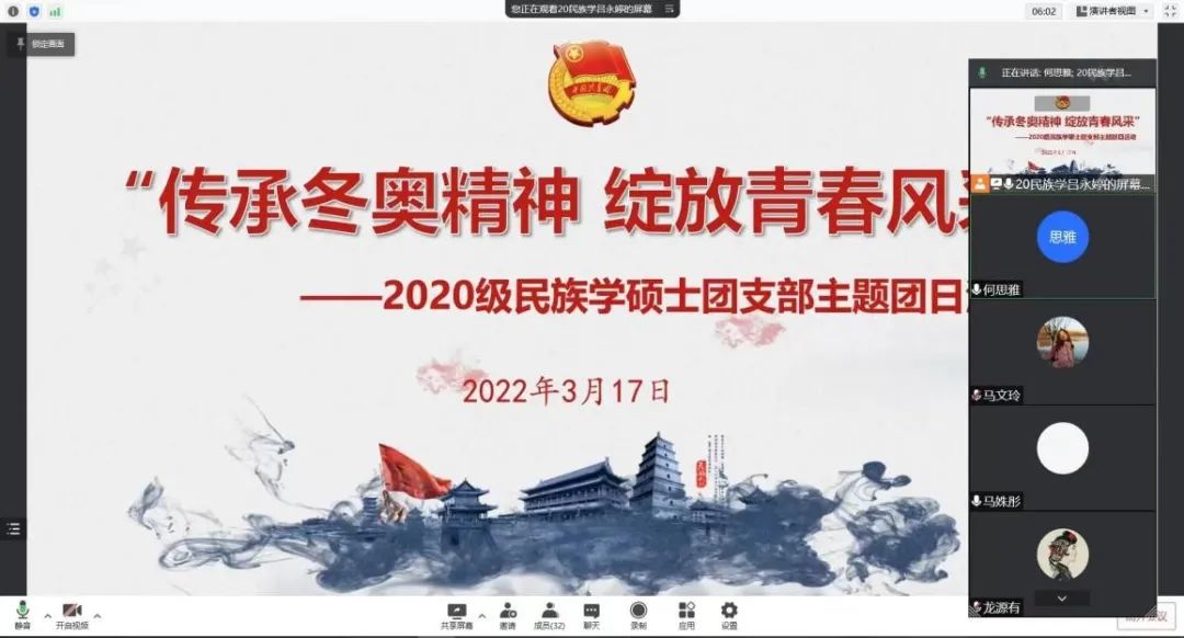 此次团日活动,2020级民族学硕士团支部的青年团员们一同回顾北京冬奥的冰雪激情、志愿激情,是为了在新时代大放青春之光彩,是为了一起向未来!通过冬奥好色先生相关的文章的学习和支部冬奥志愿者的亲身经历分享,团员们纷纷为之感染与动容,两位身边的冬奥志愿者让大家体会到冬奥赛场内外的艰辛付出和无私的志愿奉献精神。