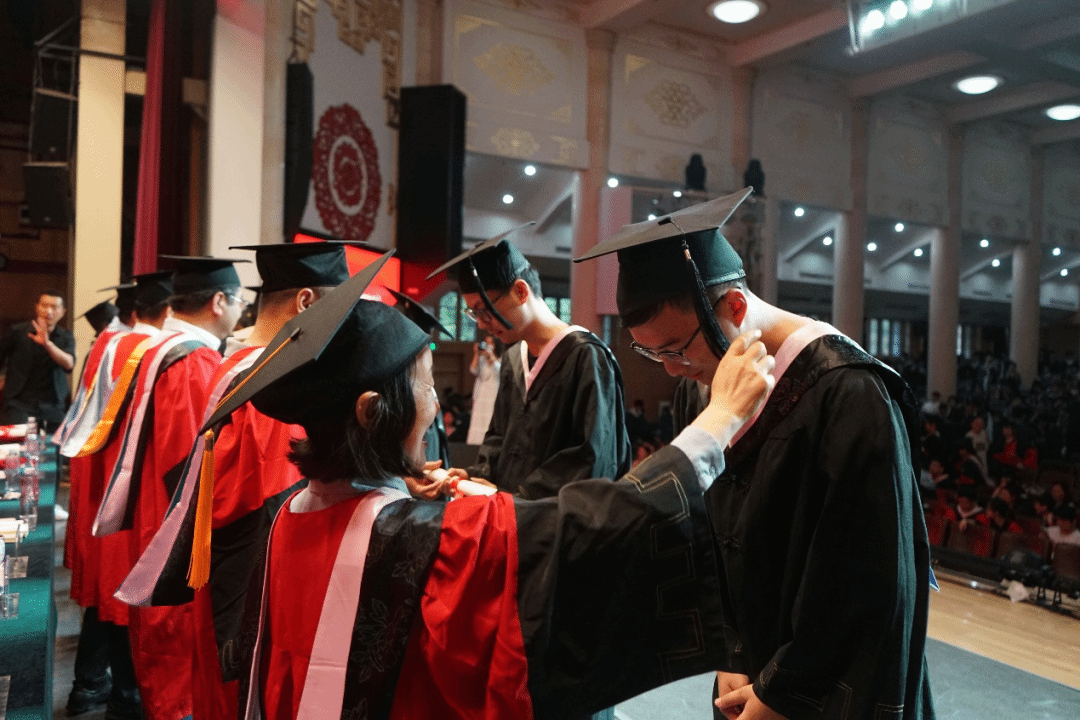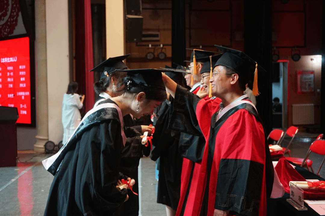 学位授予环节,在主席台就座的导师代表为2024届毕业生授予学位证书、拨穗正冠并合影留念。
